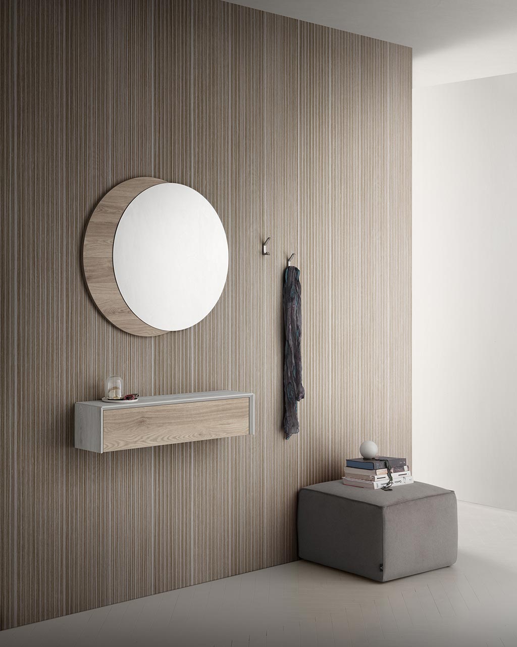 Programma modulare realizzato in melamminico bianco, tortora poro aperto, cricket, polo e rugby, bordato abs in tecnica softforming e montato a 45°.